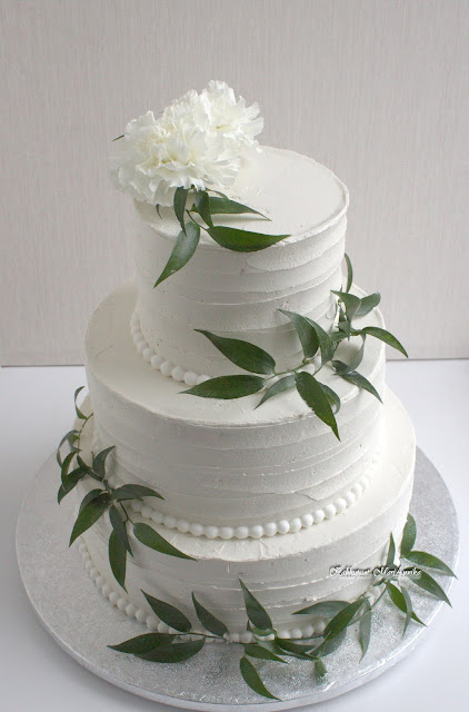 Helmikuiseen hääjuhlaan toiveena oli vaalea kreemipintainen kakku, jossa rouheaa vaakaraidoitettua sivureunaa kanttaa helminauhat <3 Koristeena aitoa kukkaa ja lehvää <3