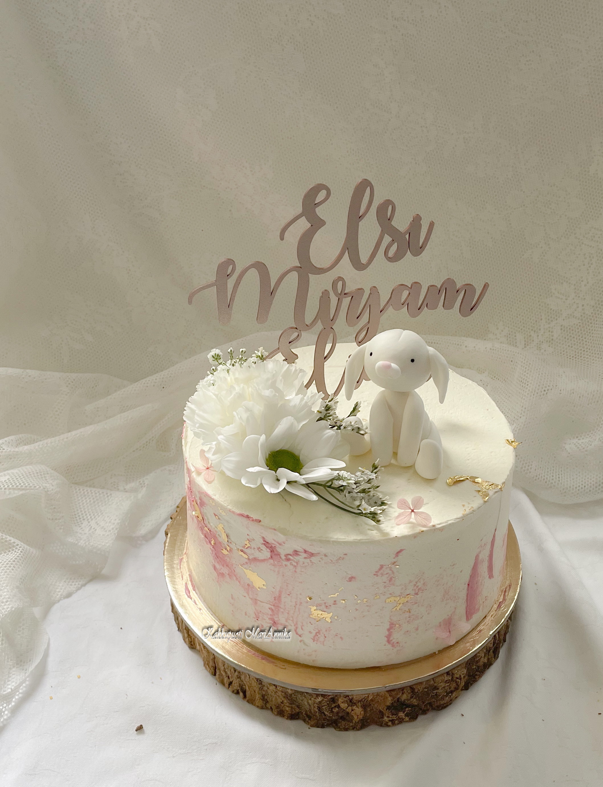 Alkusyksyn kastejuhlaan toiveena oli valkovoittoiset juhlakakut pupukoristeilla ja nimikylteillä, väriläikkänä vähän pinkkiä laveerausta kakkujen sivureunassa <3 Kauniit nimikyltit tilattiin Decocutilta.
